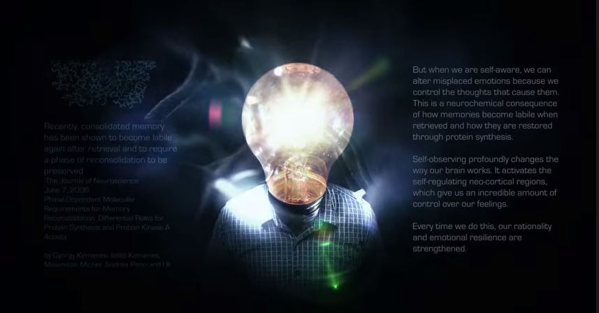 “Ancak özfarkındalığa sahip olduğumuzda, kendimizi tanıdığımızda duygularımızı düzeltebiliriz. Çünkü o duyguları oluşturan düşünceleri kontrol edebiliriz. Bu hatıraların yenide ele alındıklarında nasıl değiştiklerinin ve protein senteziyle nasıl geri dönüşüme uğradıklarının nöro-kimyasal bir sonucudur. Kendini gözlemleme, beynimizin nasıl çalıştığının şeklini derinlemesine değiştirir. Bu durum, duygularımızı inanılmaz ölçüde kontrol edebileceğimiz öz-düzenleyici neokortikal bölgeleri aktive eder. Bunu her yaptığımızda, akılcılığımız ve duygusal esnekliğimiz güçlenir.”