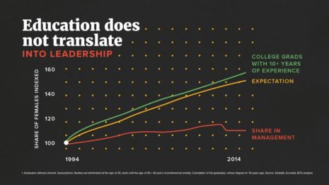 Aşağıdaki grafikten de anlaşılacağı gibi hemen hemen her yerde olduğu gibi kadınların üniversite okuduktan sonra en az 10 sene iş tecrübesi elde oranı hızla yükseliyor. Öte yandan en alttaki çizgi aynı oranda yükselmiyor. Bu çizgi üst düzey kadın yöneticileri kapsıyor. Bunun sebepleri neler olabilir. Cinsiyetle ilgili kimlikleri bir yana bırakarak objektif bir şekilde bakalım.